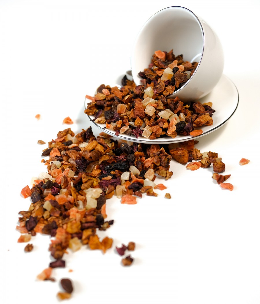 Состав: кусочки яблока, изюм, кусочки свёклы и моркови, цукаты папайи, натуральный ароматизатор «Экзотический фрукт». Вкус: тонкий, нежный, без кислинки, с лёгким цветочным ароматом и сбалансированной сладостью экзотических фруктов.